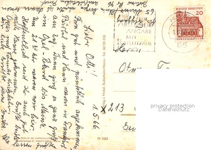 72974086 alte Postkarte Mainz Rhein Lied Mein liebes Mainz postalisch gelaufen Erhaltung siehe scans [PaolaD17] KatCode: 11110007315000