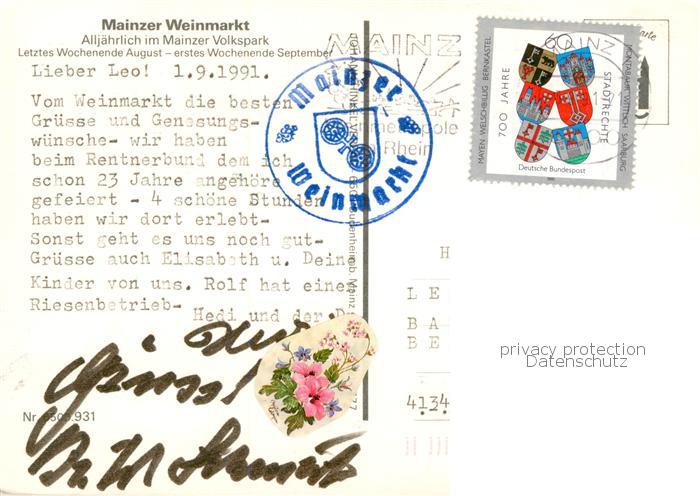 73874260 alte Postkarte Mainz Rhein Mainzer Weinmarkt postalisch gelaufen Erhaltung siehe scans [WerneD78] KatCode: 11110007315000