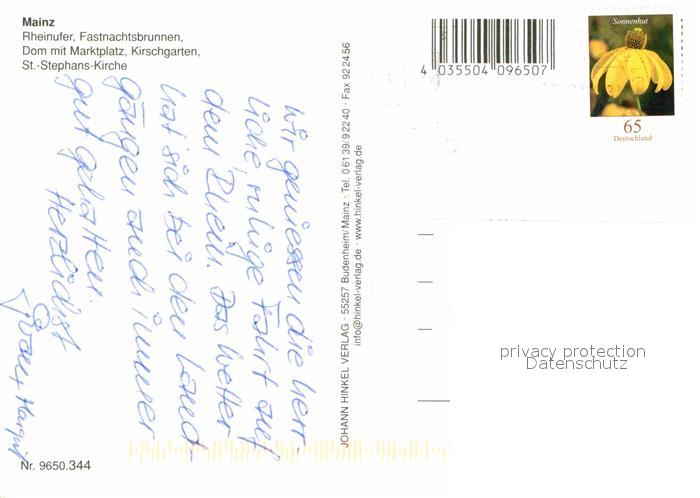 72721803 alte Postkarte Mainz Rhein Rheinufer Fastnachtsbrunnen Dom Marktplatz Kirschgarten Kirche postalisch gelaufen Erhaltung siehe scans [KathaD79] KatCode: 11110007315000