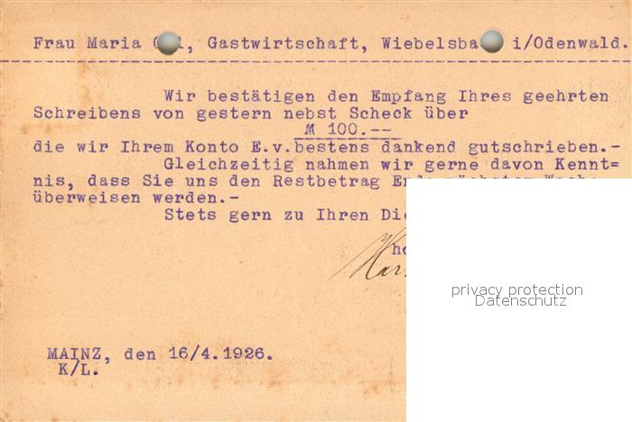 73691442 alte Postkarte Mainz Rhein Weingut Hartmann und Kuhn Korrespondenz postalisch gelaufen Erhaltung siehe scans [FriedD77] KatCode: 11110007315000