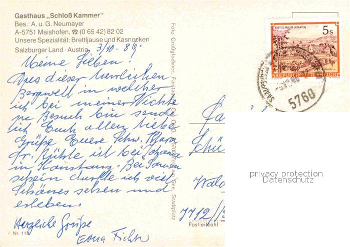 72862228 alte Postkarte Maishofen Gasthaus Schloss Kammer postalisch gelaufen Erhaltung siehe scans [LiesaD40] KatCode: 11390322050611