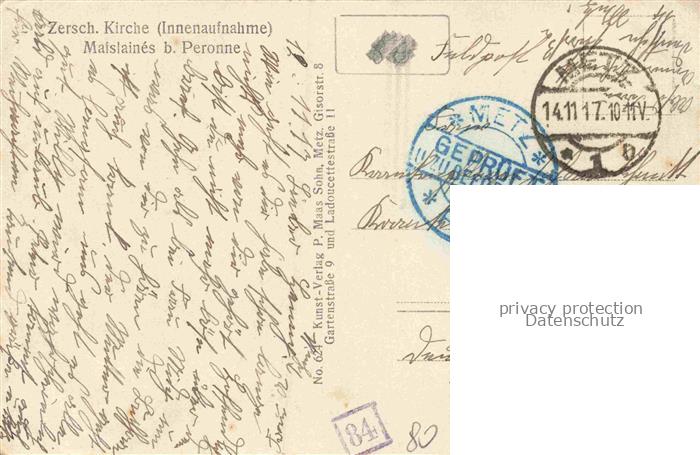 14109188 Maislaines PERONNE 80 Somme Zerschossene Kirche Ruines Grande Guerre Truemmer 1. Weltkrieg Pruefstempel postalisch gelaufen Feldpost – Stempel Erhaltung siehe scans [FriedD77] Feldpost – Stempel alte Postkarte Frie Katcode 11170080480620