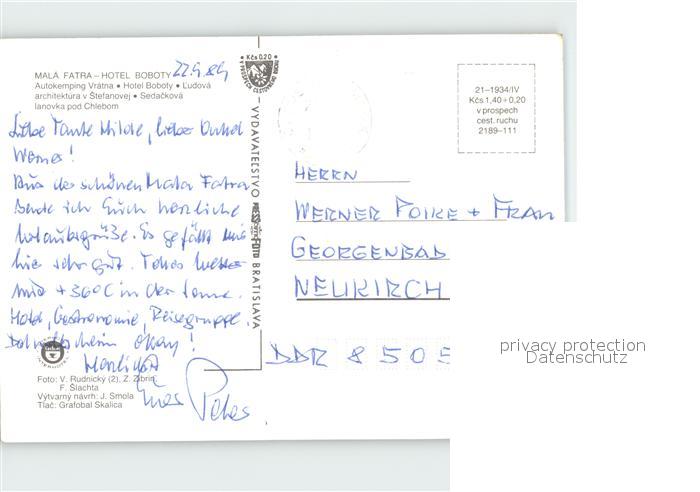 old postcard Mala Fatra Hotel Boboty postalisch gelaufen Erhaltung siehe scans [NatalD47]