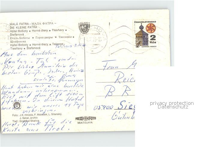old postcard Mala Fatra Hotel Boboty Horne diery Tiesnavy Stefanova postalisch gelaufen Erhaltung siehe scans