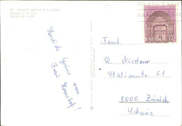 old postcard Malaga Andalucia Bellezas de la Ciudad Alcazaba Plaza de Toros Puerto Barco Hafen Stierkampfarena postalisch gelaufen Erhaltung siehe scans