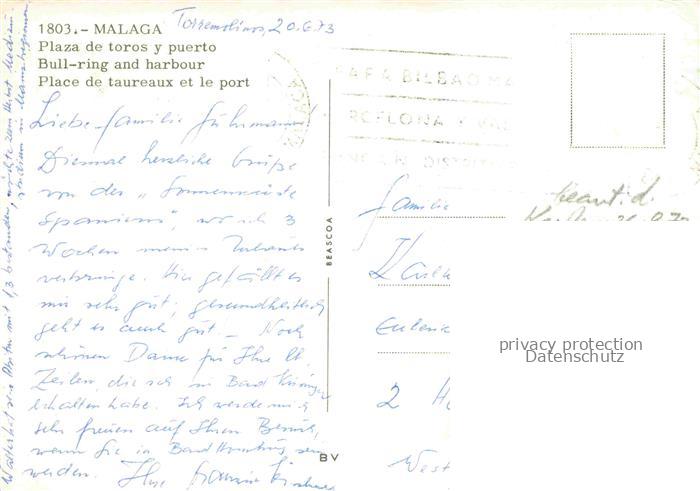 74076362 old postcard MALAGA Andalucia ES Plaza de toros y puerto Stierkamparena Hafen am Abend postalisch gelaufen Fliegeraufnahme Erhaltung siehe scans [FriedD77] KatCode: 11510
