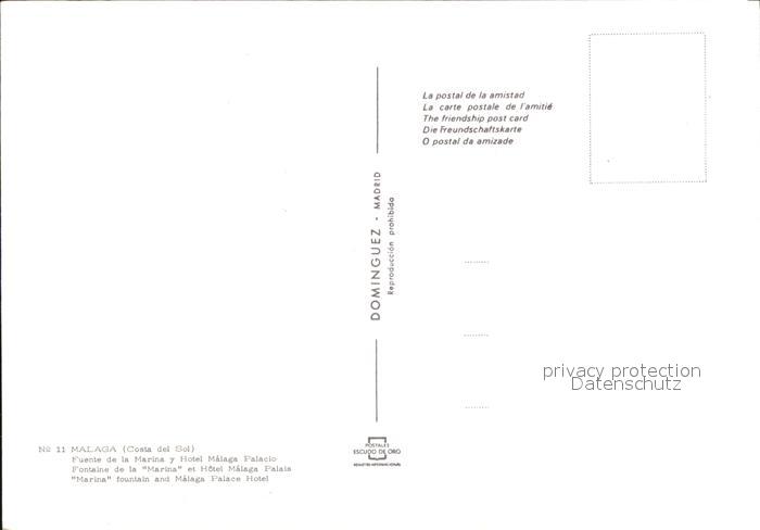 Malaga Andalucia Fuente de la Marina y Hotel Malaga Plalacio postalisch nicht gelaufen Erhaltung siehe scans