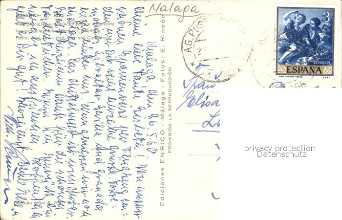old postcard Malaga Andalucia Rathaus Park und Kathedrale postalisch gelaufen Erhaltung siehe scans