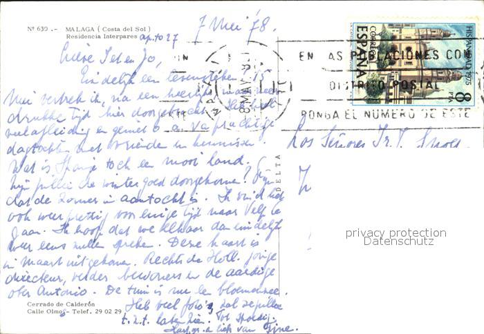 old postcard Malaga Andalucia Residencia Interpares Gastraum Bar Swimminpool postalisch gelaufen Erhaltung siehe scans