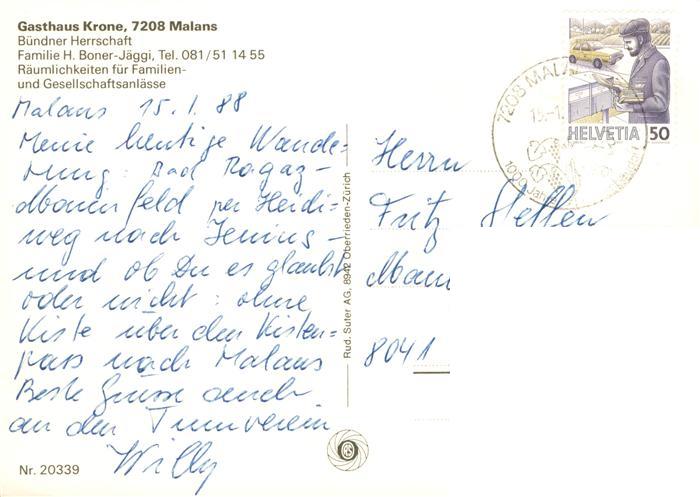 13889439 alte Postkarte Malans GR Gasthaus Krone Festtafel Gastraeume Brunnen postalisch gelaufen Erhaltung siehe scans [WerneD78] KatCode: 11470100330196