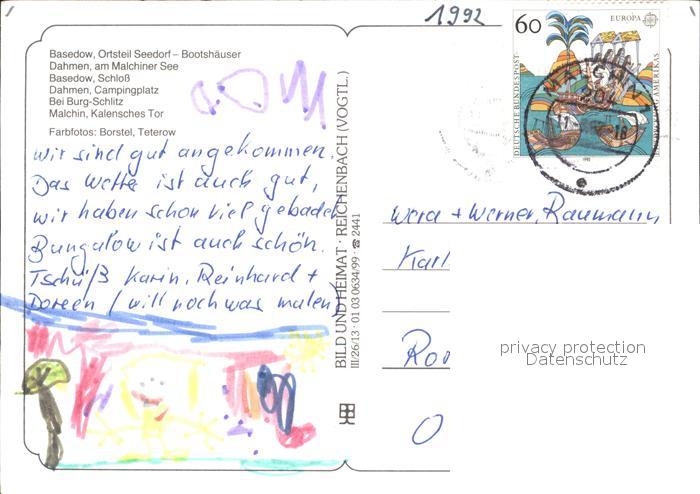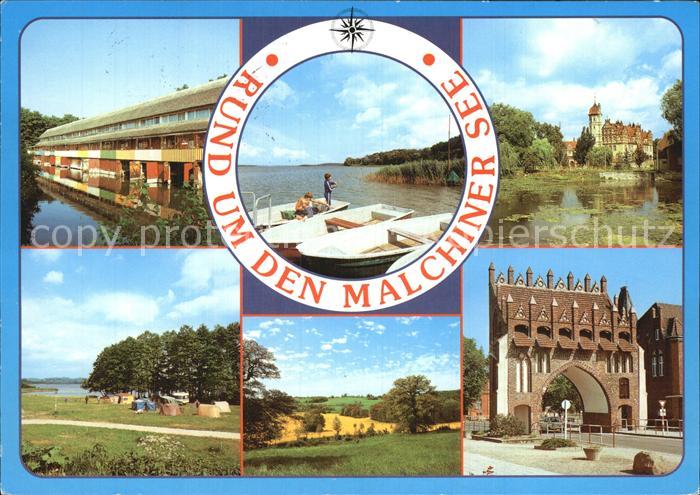 72525248 alte Postkarte Malchin Demmin Bootshaeuser Basedow Dahmen Schloss Camping Burg Schlitz Kahlensches Tor postalisch gelaufen Erhaltung siehe scans KatCode: 11110013052050