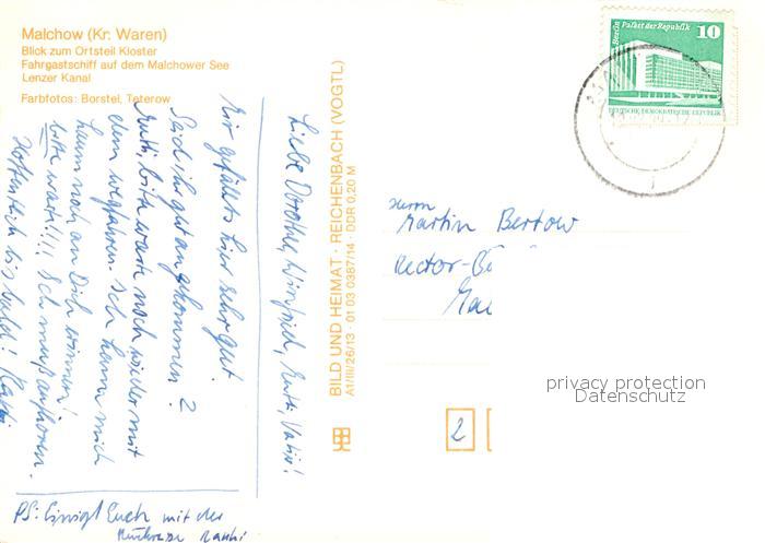 72958823 alte Postkarte Malchow Blick zum OT Kloster Fahrgastschiff Malchower See Lenzer Kanal postalisch gelaufen Erhaltung siehe scans [FriedD77] KatCode: 11110013056041
