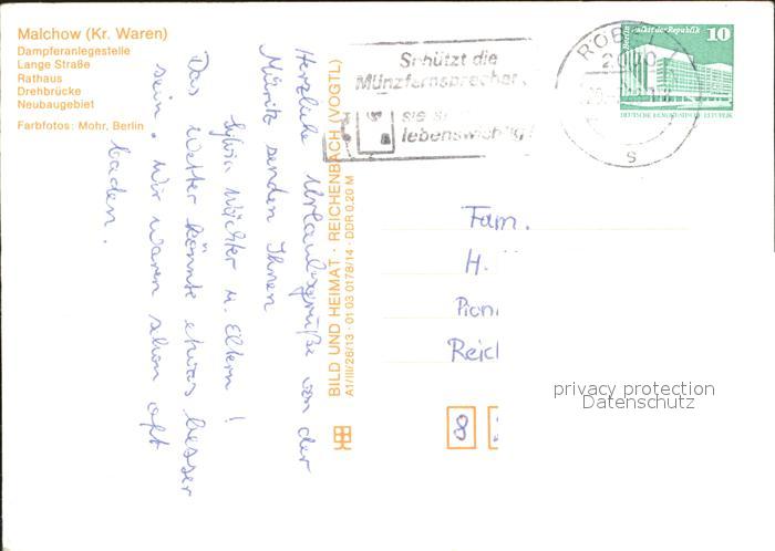 72374295 alte Postkarte Malchow Dampferanlegestelle Lange Strasse Rathaus Drehbruecke Neubaugebiet postalisch gelaufen Erhaltung siehe scans KatCode: 11110013056041