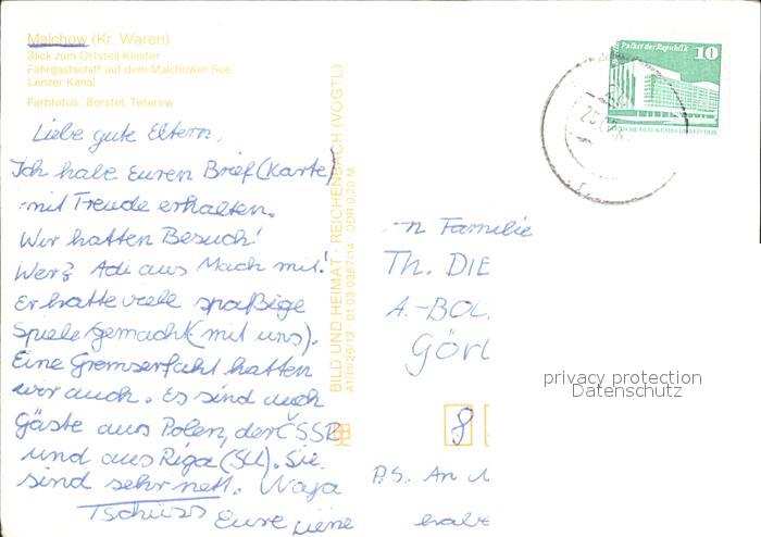 72375095 alte Postkarte Malchow Kloster Malchower See Fahrgastschiff Lenzer Kanal postalisch gelaufen Erhaltung siehe scans KatCode: 11110013056041