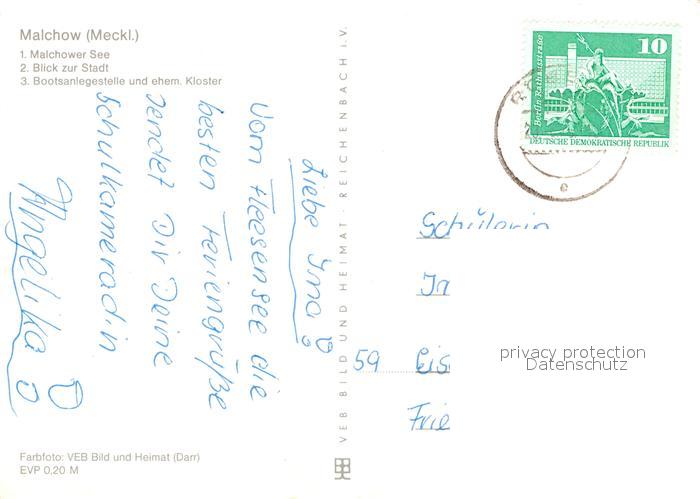 72972638 alte Postkarte Malchow Malchower See Blick zur Stadt Bootsanleger ehemaliges Kloster Mecklenburgische Seenplatte postalisch gelaufen Erhaltung siehe scans [FriedD77] KatCode: 11110013056041
