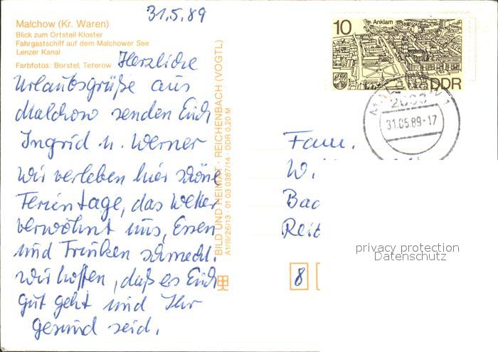 72373113 alte Postkarte Malchow OT Kloster Kirche Fahrgastschiff Malchower See Lenzer Kanal Mecklenburger Seenplatte postalisch gelaufen Erhaltung siehe scans KatCode: 11110013056041
