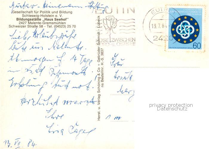 73862990 alte Postkarte Malente-Gremsmuehlen Bildungsstaette Haus Seehof Bibliothek Gastraum Terrasse postalisch gelaufen Erhaltung siehe scans [WerneD78] KatCode: 11110001055028