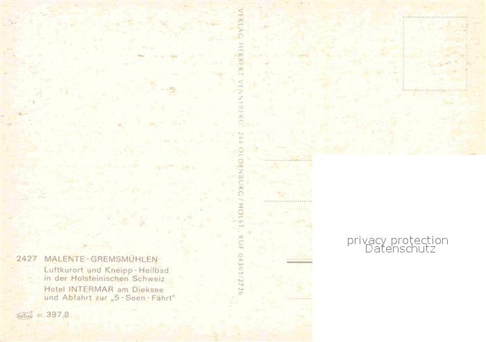 72835083 Malente-Gremsmuehlen Hotel Intermar am Dieksee Dampfer Abfahrt 5 Seen Fahrt Luftkurort Kneippheilbad Holsteinische Schweiz postalisch nicht gelaufen Erhaltung siehe scans [FriedD77] KatCode: 11110001055028