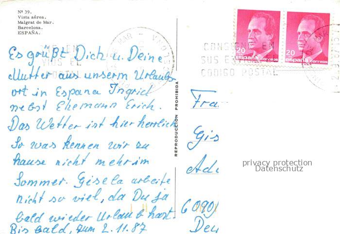 74110457 old postcard Malgrat-de-Mar Cataluna ES Fliegeraufnahme postalisch gelaufen Erhaltung siehe scans [WerneD78] KatCode: 11510