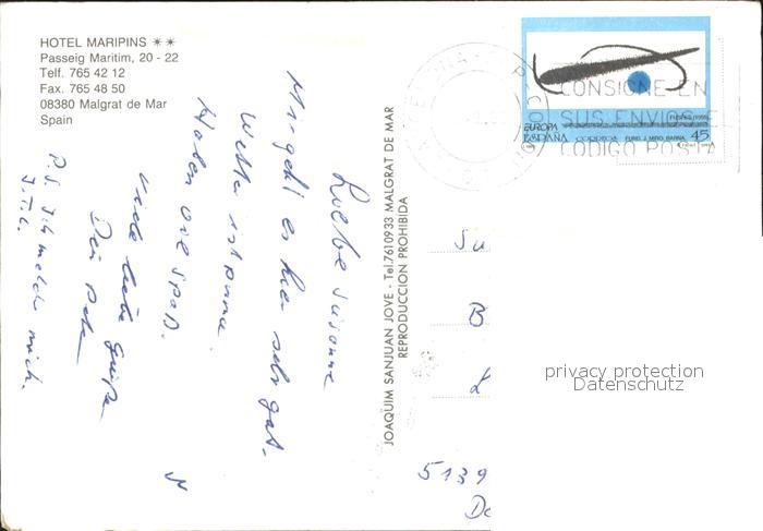 old postcard Malgrat de Mar Hotel Maripins Swimmingpool postalisch gelaufen Erhaltung siehe scans