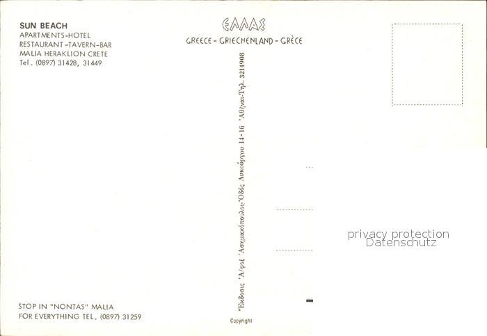 Malia Hotel Sun Beach postalisch nicht gelaufen Erhaltung siehe scans