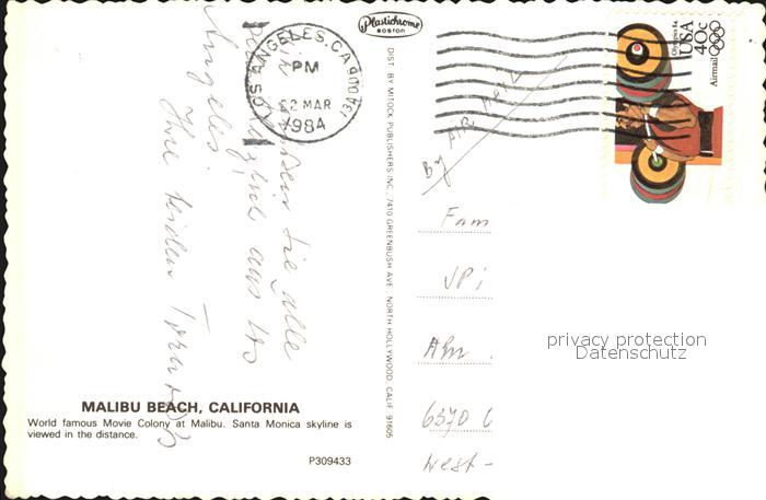 72499915 old postcard Malibu Fliegeraufnahme postalisch gelaufen Erhaltung siehe scans KatCode: 14140050000000