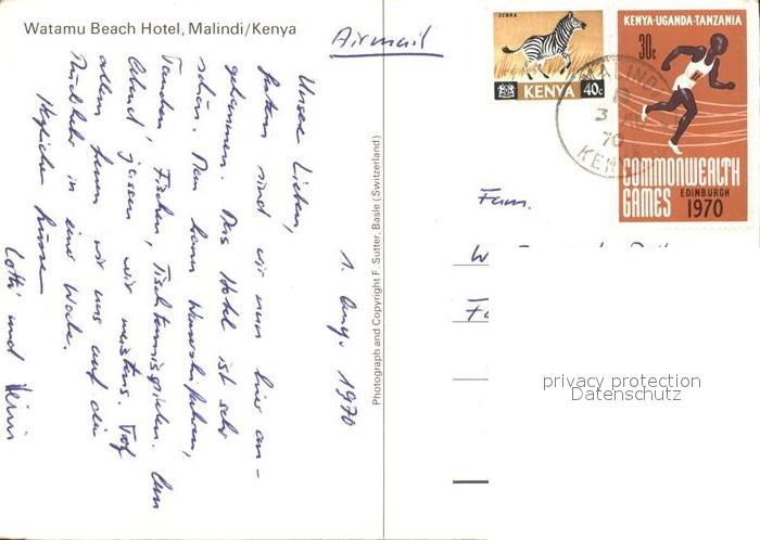 old postcard Malindi Kenia Watamu Beach Hotel postalisch gelaufen Erhaltung siehe scans