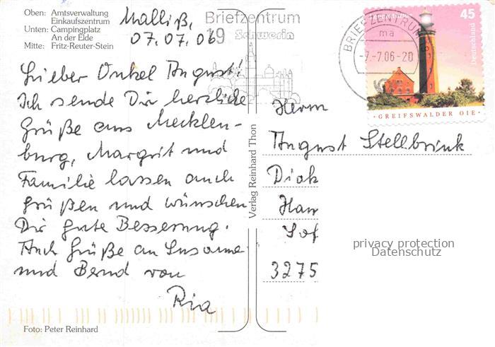 74138831 Malliss Ludwigslust Mecklenburg-Vorpommern Amtsverwaltung Einkaufszentrum Campingplatz An der Elde Fritz Reuter Stein postalisch gelaufen Erhaltung siehe scans [FriedD77] alte Postkarte Frie Katcode 11110013054072