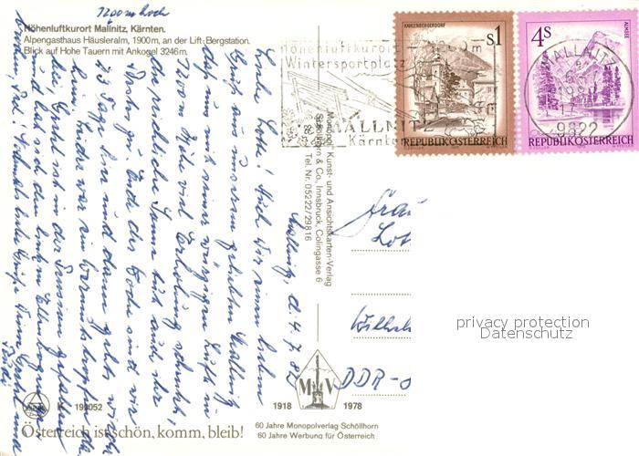 73338949 alte Postkarte Mallnitz Kaernten Alpengasthaus Haeusleralm postalisch gelaufen Erhaltung siehe scans [LiesaD40] KatCode: 11390212020618