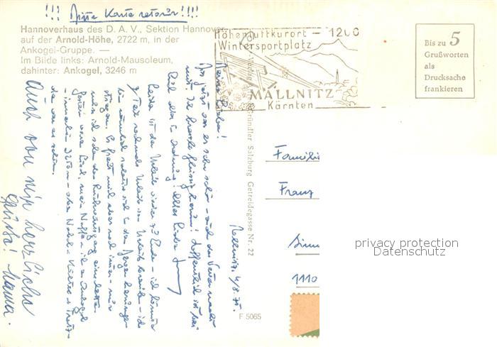73090967 alte Postkarte Mallnitz Kaernten Hannoverhaus Arnold hoehe Arnold Mausoleum Ankogel postalisch gelaufen Erhaltung siehe scans [KathaD81] KatCode: 11390212020618