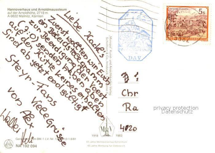 73177078 alte Postkarte Mallnitz Kaernten Hannoverhaus Arnoldmausoleum postalisch gelaufen Erhaltung siehe scans [NatalD47] KatCode: 11390212020618