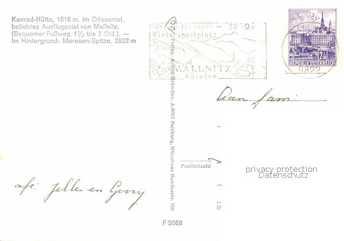 72904542 alte Postkarte Mallnitz Kaernten Konradhuette im Doesental mit Maresenspitze postalisch gelaufen Erhaltung siehe scans [FriedD77] KatCode: 11390212020618