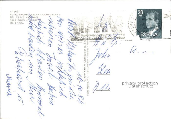 old postcard Mallorca Cala Egos Hotel Skorpios Playa und Corfu Playa postalisch gelaufen Erhaltung siehe scans