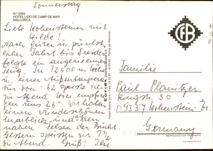 old postcard Mallorca Hotel Lido de Camp de Mar postalisch gelaufen