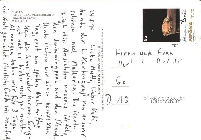 old postcard Mallorca Hotel Royal Mediterraneo postalisch gelaufen Erhaltung siehe scans