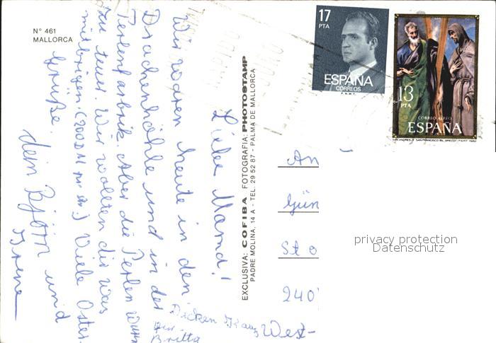 old postcard Mallorca Muehle Tracht Torrente de Pareis postalisch gelaufen Erhaltung siehe scans