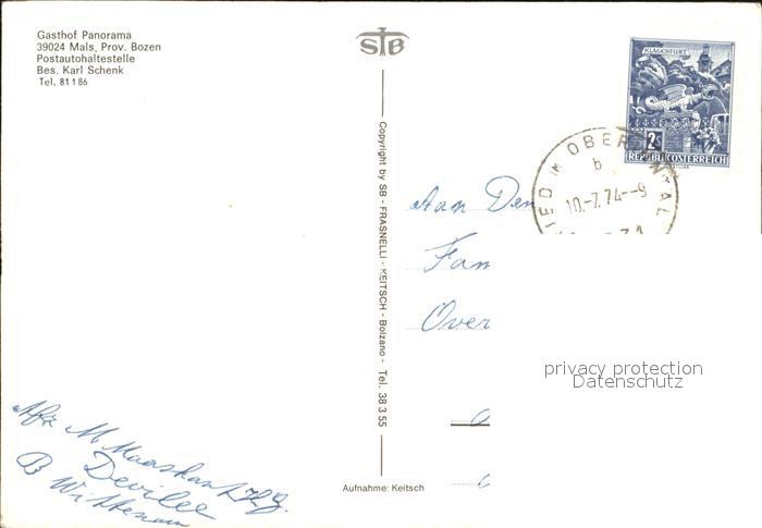 old postcard Mals Suedtirol Gasthof Panorama Restaurant Swimming Pool Kirche Turm Alpenblick postalisch gelaufen Erhaltung siehe scans
