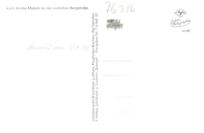 73876481 Malsch Karlsruhe Kath Kirche an der suedlichen Bergstrasse postalisch nicht gelaufen Erhaltung siehe scans [FriedD77] KatCode: 11110008215046