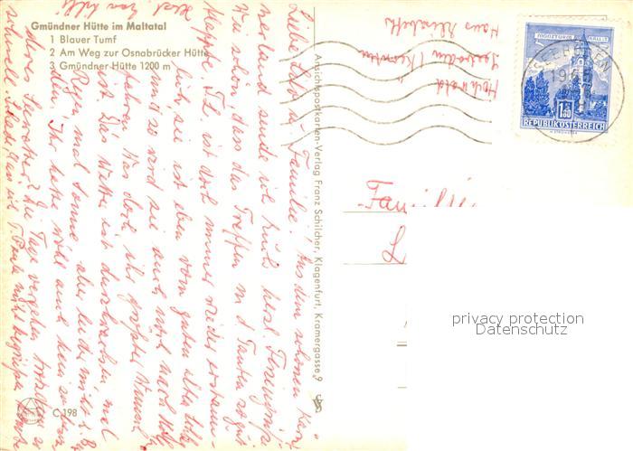 73219520 alte Postkarte Maltatal Kaernten Gmuendner Huette Blauer Tumf Wasserfall Weg zur Osnabruecker Huette postalisch gelaufen Erhaltung siehe scans [FriedD77] KatCode: 11390212020619