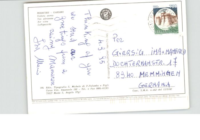 old postcard Manacore Gargano Fliegeraufnahme postalisch gelaufen