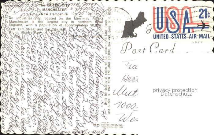 72278202 old postcard Manchester New Hampshire Elm Street City Hall Victory Park Monument Church postalisch gelaufen Erhaltung siehe scans KatCode: 14140310000000