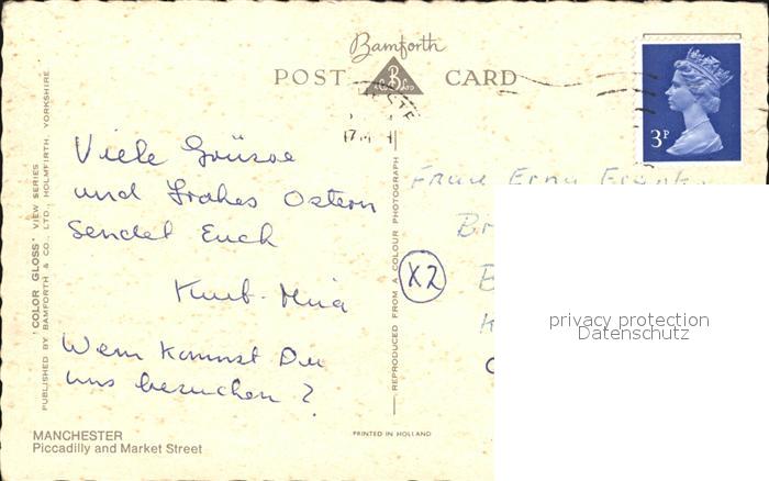 old postcard Manchester Piccadilly Market Street postalisch gelaufen Erhaltung siehe scans