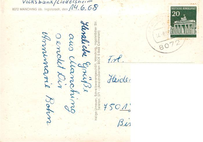 73872452 alte Postkarte Manching Ortsansichten Kirche Wohnsiedlung Hochhaeuser postalisch gelaufen Erhaltung siehe scans [FriedD77] KatCode: 11110009186137