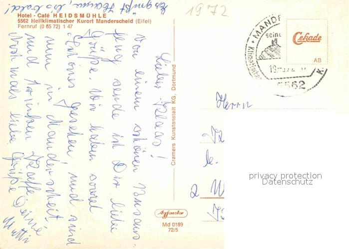 72898959 alte Postkarte Manderscheid Eifel Hotel Cafe Heidsmuehle Gartenpartie Vorderansicht Terrasse postalisch gelaufen Erhaltung siehe scans [FriedD77] KatCode: 11110007231080