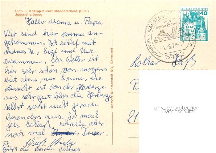 73798024 alte Postkarte Manderscheid Eifel Jugendherberge postalisch gelaufen Erhaltung siehe scans [WerneD78] KatCode: 11110007231080