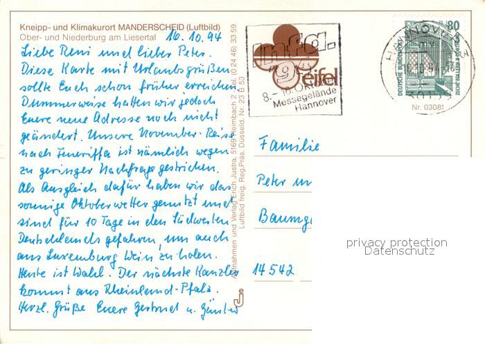 73725762 alte Postkarte Manderscheid Eifel Ober und Niederburg am Liesental Fliegeraufnahme postalisch gelaufen Erhaltung siehe scans [WerneD78] KatCode: 11110007231080