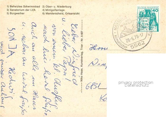 73181678 alte Postkarte Manderscheid Eifel Ober Unterburg Eifelsanatorium Schwimmbad Burgweiher Minigolf postalisch gelaufen Erhaltung siehe scans [KathaD81] KatCode: 11110007231080