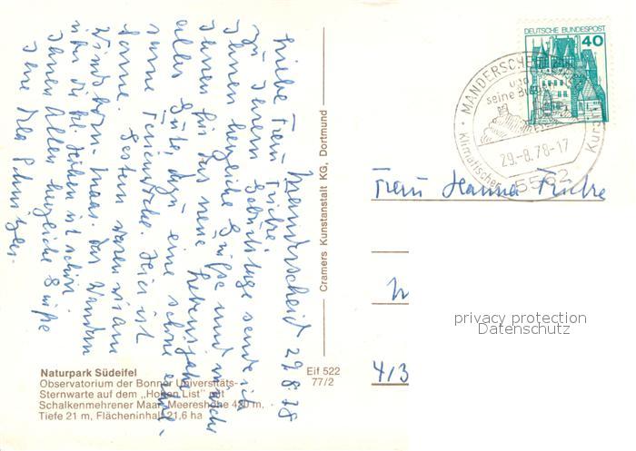 73701049 alte Postkarte Manderscheid Eifel Observatorium der Bonner Universitaets Sternwarte mit Schalkenmehrener Maar postalisch gelaufen Fliegeraufnahme Erhaltung siehe scans [WerneD78] KatCode: 11110007231080