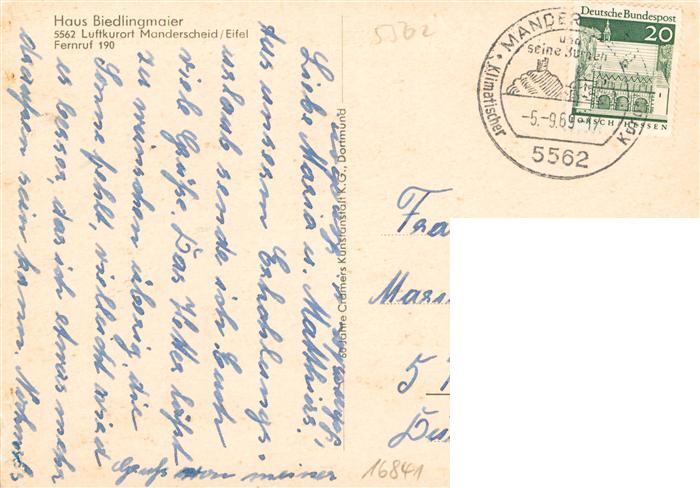 73898160 alte Postkarte Manderscheid Eifel Pension Biedlingmaier Blick auf die Burgen postalisch gelaufen Erhaltung siehe scans [WerneD78] KatCode: 11110007231080