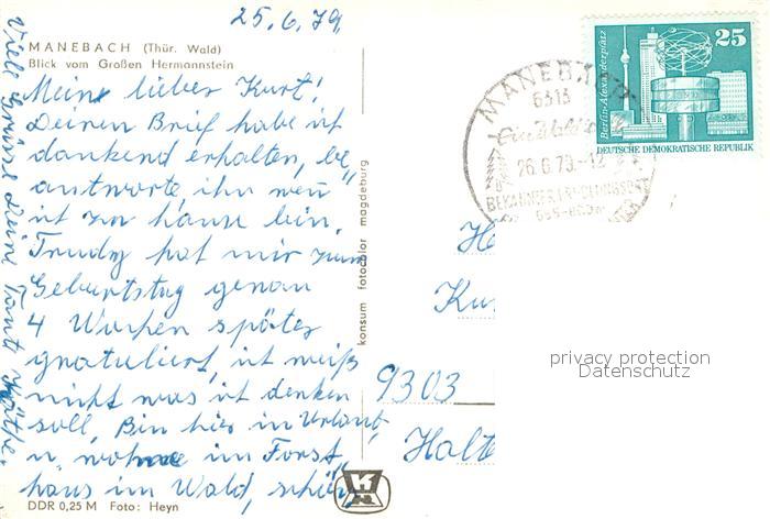 73734709 alte Postkarte Manebach Blick vom Grossen Hermannstein postalisch gelaufen Erhaltung siehe scans [WerneD78] KatCode: 11110016070029